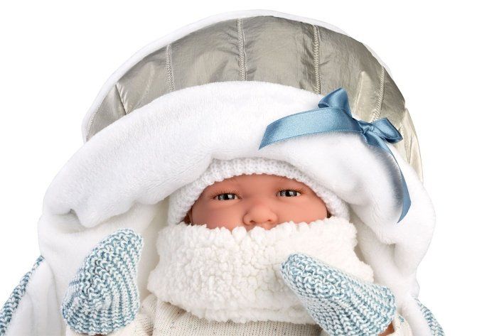 6dílný obleček s podložkou s kapucí a popruhy pro přenášení pro panenku miminko NEW BORN Llorens velikosti 40-42 cm. Vyrobeno ručně ve Španělsku, baleno v igelitovém obalu s plastovým ramínkem. Doporučený věk od 3 let.