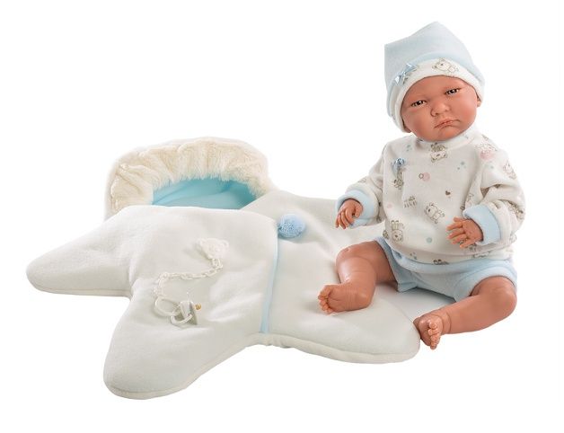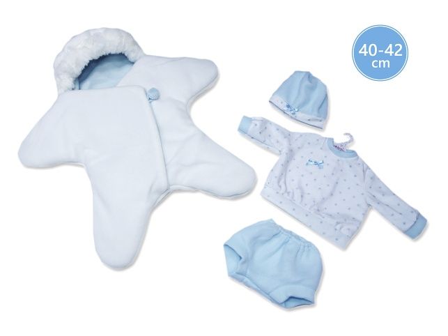 3dílný obleček s oboustranným fleecovým overalem ve tvaru hvězdy pro panenku miminko NEW BORN Llorens velikosti 40-42 cm. Vyrobeno ve Španělsku, baleno v igelitovém obalu s plastovým nebo kartonovým ramínkem. Doporučený věk od 3 let.
