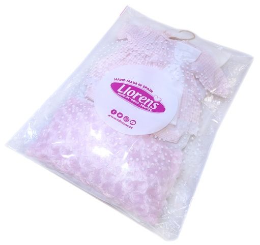 3dílný obleček s ozdobným polštářkem a peřinkou a plátěným kapesníčkem staženým průhlednou stužkou, kterou jde použít jako ozdobu na hlavu. Určeno pro panenku miminko NEW BORN Llorens velikosti 40-42 cm. Vyrobeno ve Španělsku, baleno v igelitovém obalu s plastovým nebo kartonovým ramínkem. Doporučený věk od 3 let.