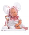 3dílný obleček s ozdobnou podložkou s ouškama pro panenku miminko NEW BORN Llorens velikosti 40-42 cm. Vyrobeno ve Španělsku, baleno v igelitovém obalu s plastovým nebo kartonovým ramínkem. Doporučený věk od 3 let.