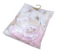 2dílný obleček s fleecovou oboustrannou dečkou s mašličkami ve tvaru srdíčka a měkoučkým oboustranným polštářkem pro panenku miminko NEW BORN Llorens velikosti 40-42 cm. Stužka na hlavě nění součástí balení. Vyrobeno ve Španělsku, baleno v igelitovém obalu s plastovým nebo kartonovým ramínkem. Doporučený věk od 3 let.