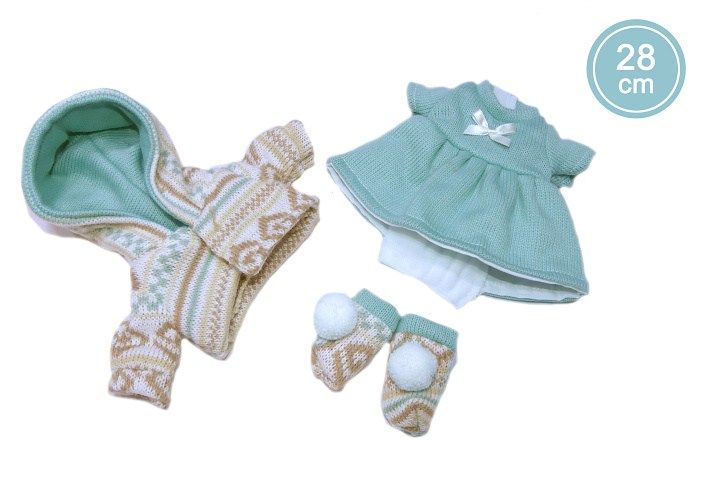 4dílný obleček pro panenku Llorens velikosti 28 cm. Vyrobeno ve Španělsku, baleno v igelitovém obalu s plastovým nebo kartonovým ramínkem. Doporučený věk od 3 let.
