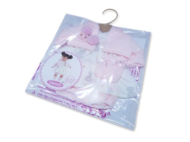 4dílný obleček s ozdobnými gumičkami do vlásků pro panenku Llorens velikosti 33 cm. Vyrobeno ve Španělsku, baleno v igelitovém obalu s plastovým nebo kartonovým ramínkem. Doporučený věk od 3 let.