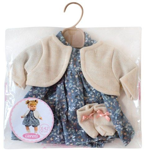 4 kusy oblečení pro panenku Llorens velikosti 42 cm. Vyrobeno ručně ve Španělsku, baleno v igelitovém obalu s plastovým ramínkem. Doporučený věk od 3 let.
