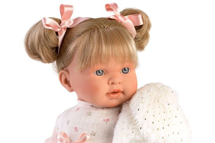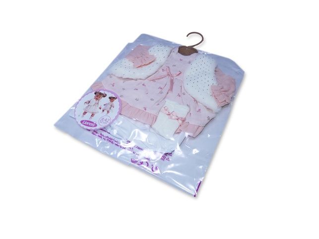 4dílný obleček pro panenku Llorens velikosti 42 cm. Vyrobeno ve Španělsku, baleno v igelitovém obalu s plastovým nebo kartonovým ramínkem. Doporučený věk od 3 let.