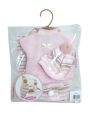 3dílný obleček včetně přenosného vaku na suchý zip pro panenku miminko Llorens velikosti 30 cm. Vyrobeno ručně ve Španělsku, baleno v igelitovém obalu s plastovým ramínkem. Doporučený věk od 3 let.