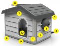 Domeček tvoří 6 hlavních modulárních dílů: stěna s vchodem, otevírací zadní stěna, stěna s dávkovačem krmiva, stěna bez otvoru, podlaha s malými drážkami, které umožňují lepší odvod vody směrem ven při mytí, sedlová střecha plus 2 malé trojúhelníkové části tvořící štíty střechy, 4 konstrukční tyče a spojovací elementy.