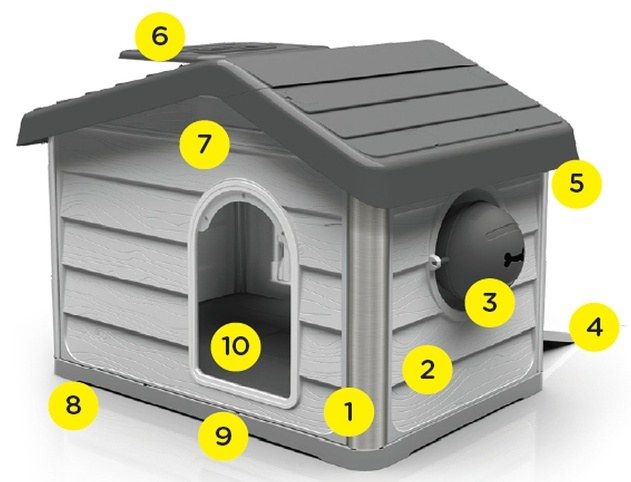 Domeček tvoří 6 hlavních modulárních dílů: stěna s vchodem, otevírací zadní stěna, stěna s dávkovačem krmiva, stěna bez otvoru, podlaha s malými drážkami, které umožňují lepší odvod vody směrem ven při mytí, sedlová střecha plus 2 malé trojúhelníkové části tvořící štíty střechy, 4 konstrukční tyče a spojovací elementy.