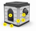 Domeček tvoří 6 hlavních modulárních dílů: stěna s vchodem, stěna s dávkovačem krmiva, 2 x stěna bez otvoru, 2 x podlaha/ střecha s malými drážkami, které umožňují lepší odvod vody směrem ven při mytí plus 4 konstrukční tyče a spojovací elementy.