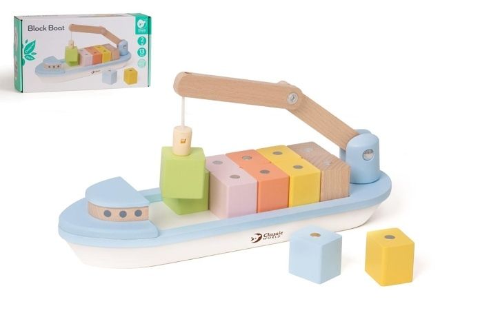 Zábavná malá nákladní loď, naložená pastelově barevným zbožím. Loď má 12 barevných magnetických bloků a děti je mohou libovolně nakládat a vykládat posunutím flexibilního jeřábu. Barevná loď poskytne hodiny nápadité zábavy pro vaše batole, zlepší jeho obratnost a koncentraci.
