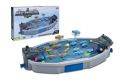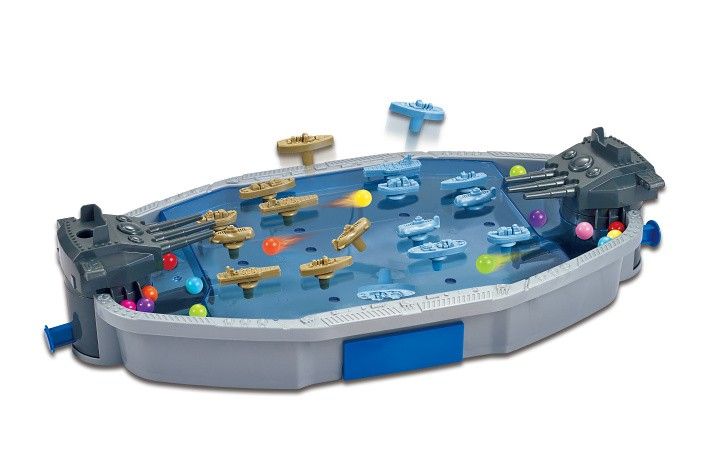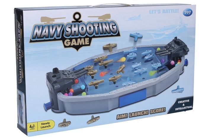 Lodě bitevní, hra pro 2 hráče. Obsah balení: Hrací plocha, 2xdělo, 10x modré plavidlo, 10x zelené plavidlo, 10x modrý kolík, 10x zelený kolík, 30x kulička. Děla nasaďte na každé straně hrací plochy. Plavidla nasaďte na kolíky a libovolně je rozmístěte na své straně hrací plochy. Zásobník děla pojme 7 kuliček. Dělo střílí stlačením modré páčky na zadní straně. Míčky létají pod povrchem hrací plochy. Cílem je trefit kolík, na kterém je nasazeno plavidlo protihráče. Střely létají velkou rychlostí, při zásahu může kolík s plavidlem vystřelit mimo hrací plochu, chraňte oči. Vystřelené kuličky můžete vyjmout dvířky na straně hrací plochy. Dvířka opět zavřete před pokračováním ve hře.