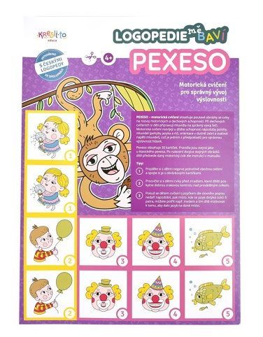 Pexeso obsahuje 25 dvojic karet s poutavými obrázky a cviky, které souvisí s různými hláskami a slovy. hraje se jako klasické pexeso, ale s tím rozdílem, že dítě je tak zábavnou formou motivováno opakovat logopedická cvičení. tyto cviky jsou na pexesu podrobně popsány, takže je může s dětmi procvičovat i laik.