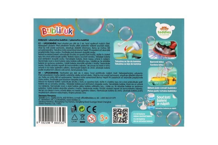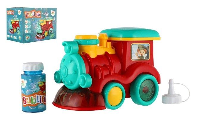 Roztomilá lokomotiva se zvukem, světlem a bublifukem. Po zapnutí vydává zvuky houkání, barevně bliká a během jízdy vytváří bublinky. Součástí balení je bublifuk, náplň a tekutina se naleje do komínu pomocí přiloženého kapátka. Baterie 4 x AA nejsou součástí balení. Rozměr lokomotivy: 18 cm