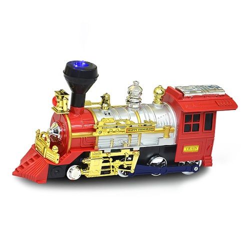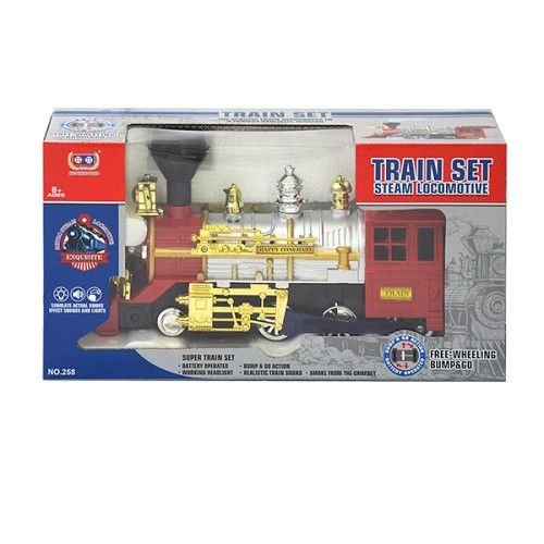 Narážecí a kouřící lokomotiva v elegantním designu. Po zapnutí sama jezdí, svítí, vydává realistický zvuk a kouří z komína. Pokud lokomotiva narazí na překážku, otočí se a pokračuje v cestě. Délka je 28 cm. Funguje na 4x1,5V AA baterie, které nejsou součástí balení.