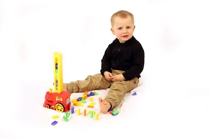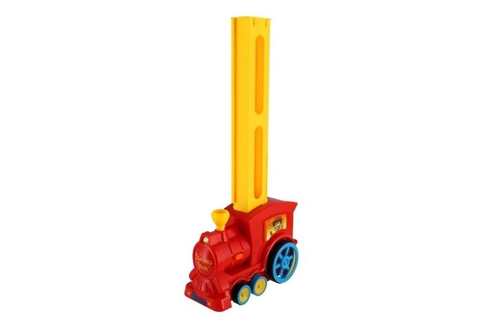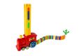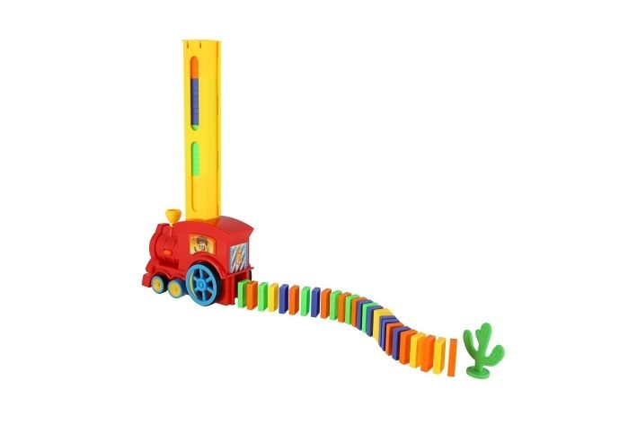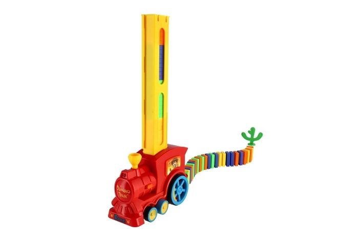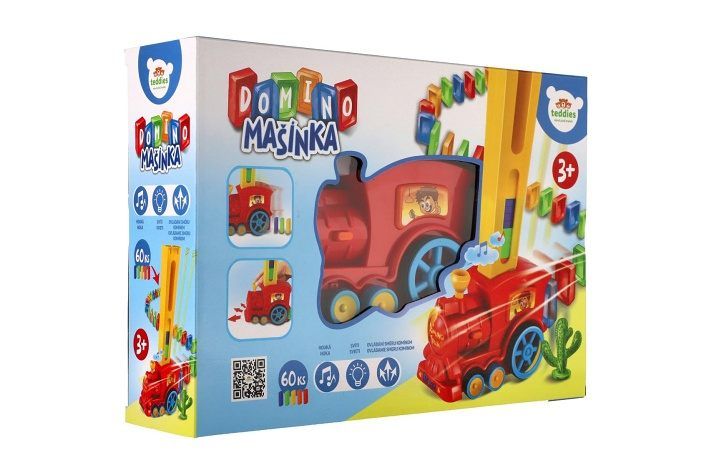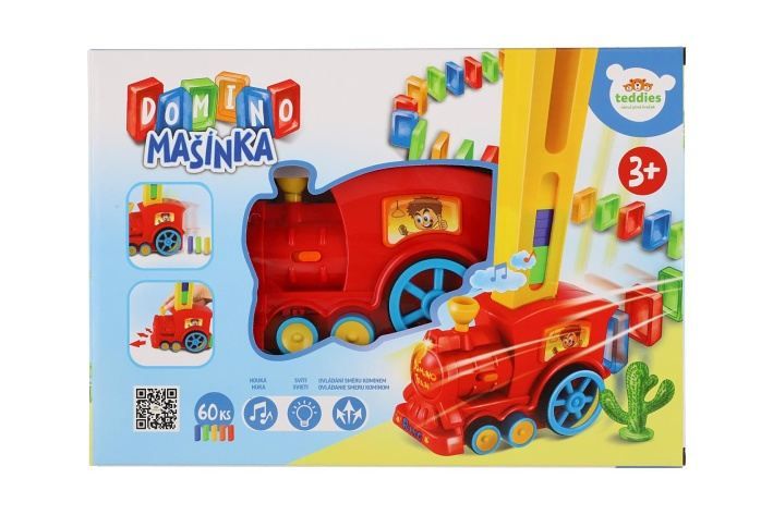Lokomotiva skládající barevné domino 60ks. Vláček za jízdy staví řadu z domina, kterou můžete zbourat. Při nárazu vláček změní směr jízdy a jede dál, otočením komínku mašinky změníte směr, při jízdě svítí a cinká. Baterie 2x AA nejsou součástí balení.