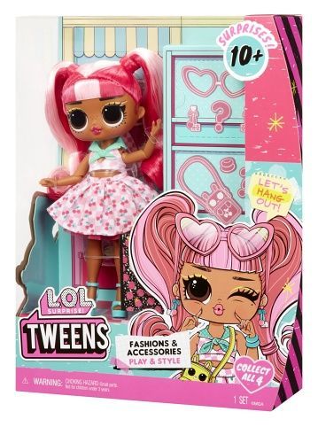 Představujeme L.O.L. Surprise! Tweens panenky! Tyto oblíbené, okouzlující Tweens se vrací v novém stylu s novými účesy a módními outfity! Objev, co se skrývá uvnitř, a připrav se rozbalit nádhernou módní panenku Tweens s 10 překvapeními. Čekají tě jedinečné outfity, roztomilé doplňky, stylové boty a ještě mnohem víc! Nasbírej všechny 4 nejlepší kamarádky! Obsah balení:? • 1 Tweens panenka Cherry B.B. • 1 outfit, boty, hřeben na vlasy • 1 deník a stojánek na panenku Velikost L.O.L. panenky: cca 16,5 cm.