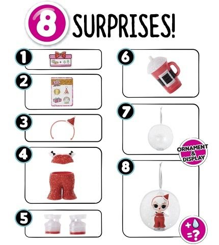 V této Zimní sérii můžeš sesbírat 2 panenky z limitované edice. Skvěle se hodí na Vánoce. Kouli lze zavěsit i s panenkou na stromeček jako vánoční ozdobu. Panenka po napití z lahvičky může plakat, plivat vodu nebo čůrat. Pro lepší efekt dej panence napít dvakrát. Obsah balení: • 1 L.O.L. panenka • 1 lahvička na pití • 8 překvapení v každém balení • doplňky, které můžou nosit všechny L.O.L. panenky • 1 tajná zpráva 2 panenky v různém stylu. Velikost L.O.L. panenek: cca 8 cm.