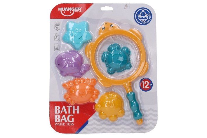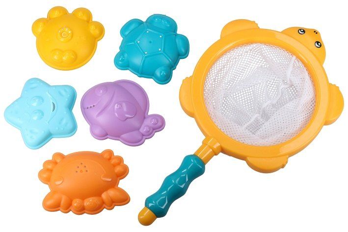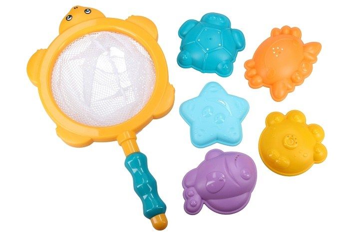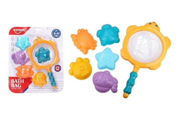 Lovení zvířátek do vany. Balení obsahuje 5 formiček zvířátek s dírkami na odtok vody, síťku na lovení. Délka síťky 28 cm.