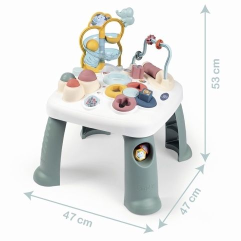 Všestranný hrací stůl Little Smoby Activity se svými četnými funkcemi slibuje vzrušující herní dobrodružství pro děti od 12 měsíců. Tato interaktivní výuková hračka zve děti k objevování a zkoumání. Mnoho barevných herních prvků přitahuje pozornost těch nejmenších a trénuje motorické a sluchové dovednosti. Ve hře na rozpoznávání tvarů se stavební kameny zasouvají do příslušných otvorů. Malá kuličková dráha s rampou vás zve ke hře a zkoušení, stejně jako motorická smyčka, tři rohy a prak, pomocí kterého lze míč katapultovat do vzduchu. Malé otočné zrcátko završuje výkonné funkce herního stolu. Rozměry produktu (DxŠxV): 47 x 47 x 53,2 cm.
