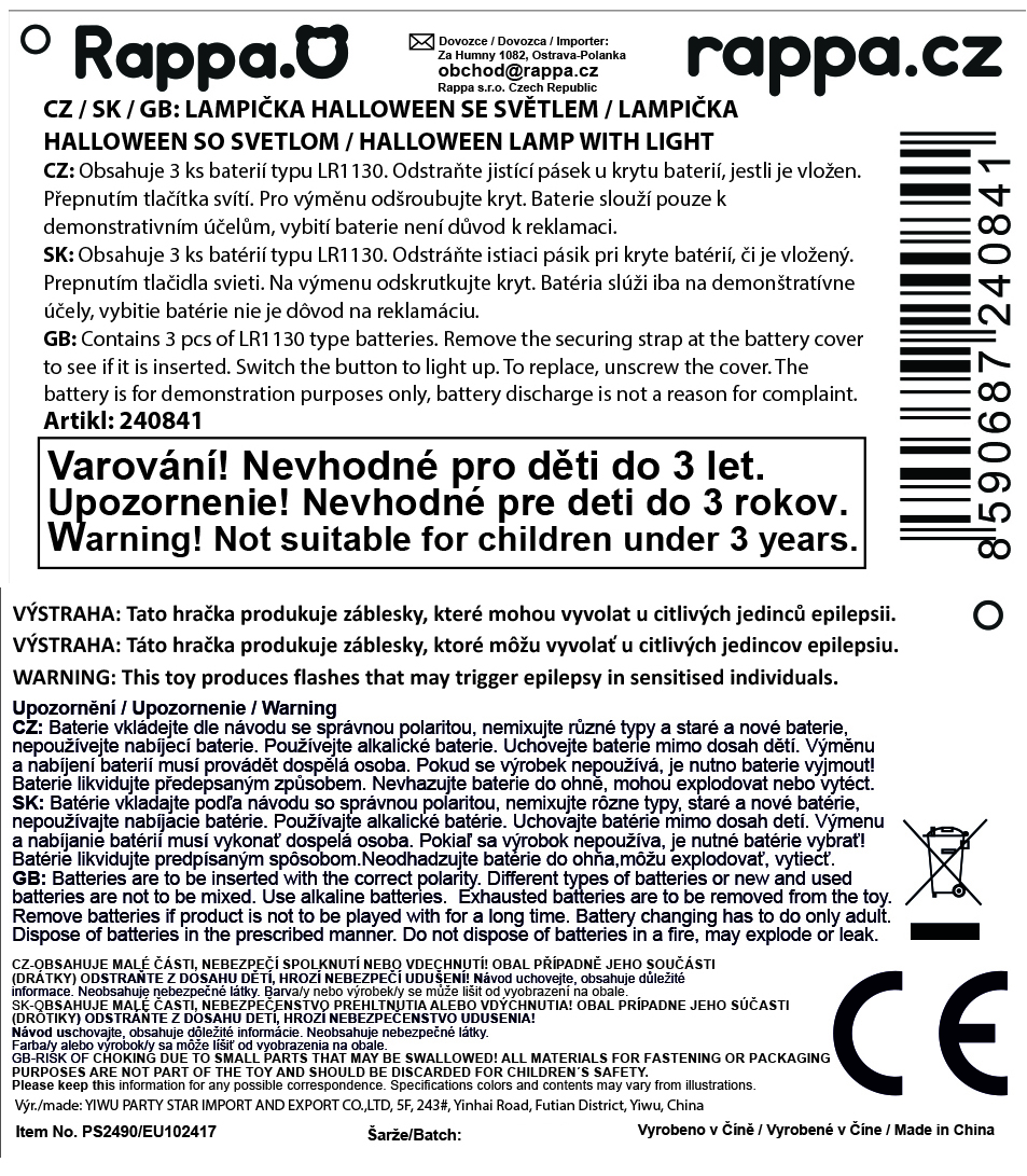 Halloweenské svítidlo na tu pravou Halloween párty! Plastová lampička je funkční na 3 baterie typu LR1130 (baterie jsou součástí balení). Stačí jen přepnout přepínač ve spodní části. Lampička po zapnutí bliká různými barvami, které se samy přepínají. Velikost lampičky je cca 13 cm. Různé druhy - zasíláme dle skladových zásob