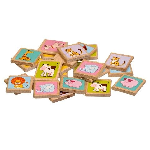 Zvířátka - dřevěné pexeso s obrázky zvířátek bude určitě rádo hrát každé malé dítě. Balení tvoří 12 párů dřevěných obrázků různých zvířat. Po skončení hry lze kartičky uschovat ve lněném pytlíku. Pexeso pomáhá rozvíjet paměť a logické myšlení nenásilnou, hravou formou. Rozměry kartiček 4,5 cm x 4,5 cm x 0,8 cm.