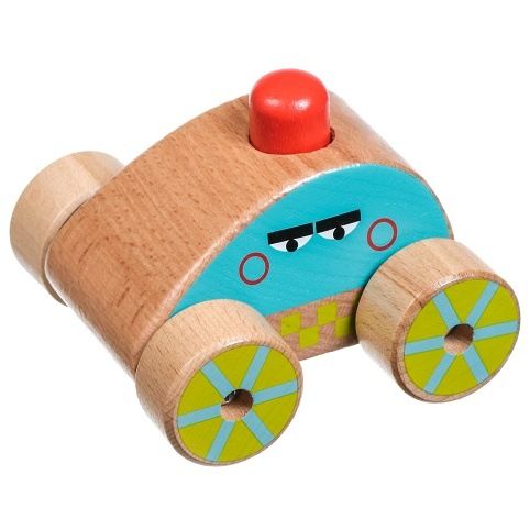 Dřevěné pískající auto s tlačítkem. Při zatlačení na tlačítko vydává pískavý zvuk. Délka auta 9 cm, šířka 8,5 cm, výška 6,5 cm.