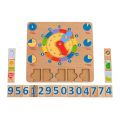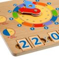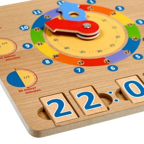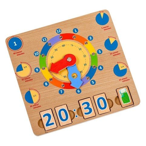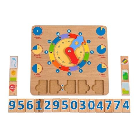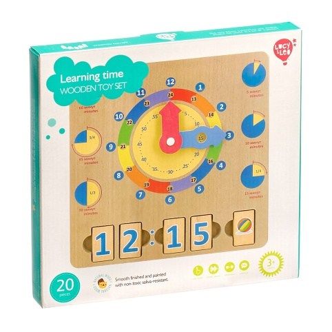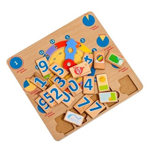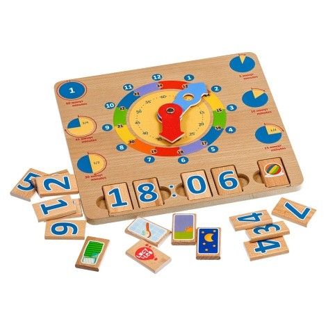 Učíme se hodiny je dřevěná naučná hrací deska s hodinami, určená k výuce hodin, časových intervalů a celkového pochopení, jak čas vlastně běží. Deska obsahuje obrázky různých časových intervalů a velké barevné hodinové ručičky s jasnými časovými segmenty. Dále ji tvoří 14 bloků s čísly a 6 bloků s obrázky denních činností. Čtyři časové bloky lze vložit do zdířek tak, aby představovaly digitální hodiny, a pátý blok představuje akci, která je přítomna v denním režimu dítěte ve stanovenou dobu. Tímto hravým způsobem se děti rychle naučí pouhým pohledem rozeznávat a určovat čas a hodiny. Rozměr desky 24 x 24 x 1 cm, rozměr bloků 4 x 2,5 cm.
