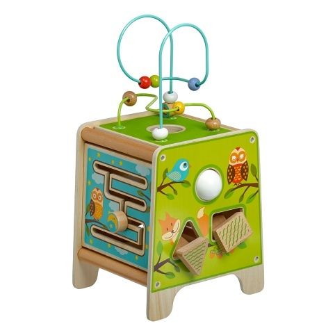 Dřevěná motorická kostka 5v1 s xylofonem kombinuje několik vzdělávacích a zábavných prvků najednou. Nahoře najdete korálkový labyrint se dvěmi zakřivenými kolejnicemi, který se dá vyjmout a otočit směrem do kostky tak, aby byl zcela uschován. Na ostatních stranách je xylofon s paličkami, vkládačka dvoudílných rotačních geometrických tvarů, dřevěný motorický labyrint, rotující kolečko, otočné prvky a zábavná hra s přesouváním kolíčku v drážce. Všechny strany jsou zdobeny krásnými barevnými obrázky a zábavnými postavičkami zvířátek, které udržují pozornost dítěte, podporují fantazii a senzomotorické schopnosti. Délka kostky 20 cm, výška 26 cm. Výška labyrintu 18 cm. Délka paliček 15 cm. Velikost geometrických tvarů cca 5,5 cm.