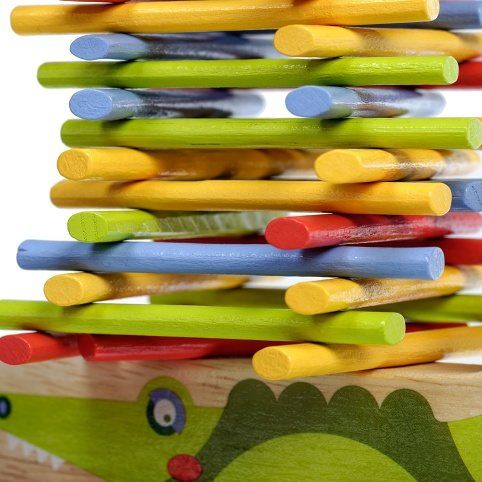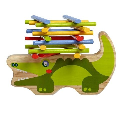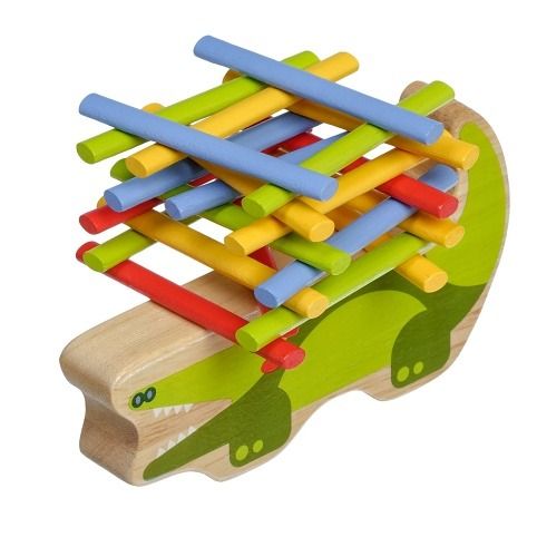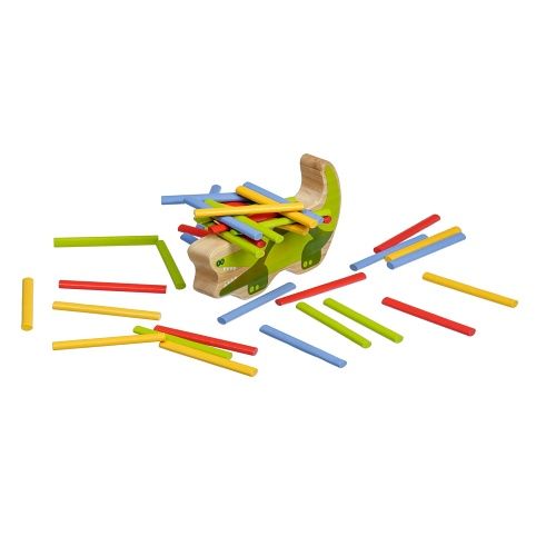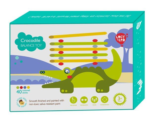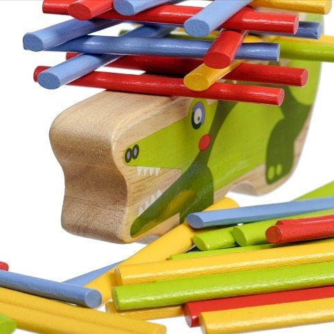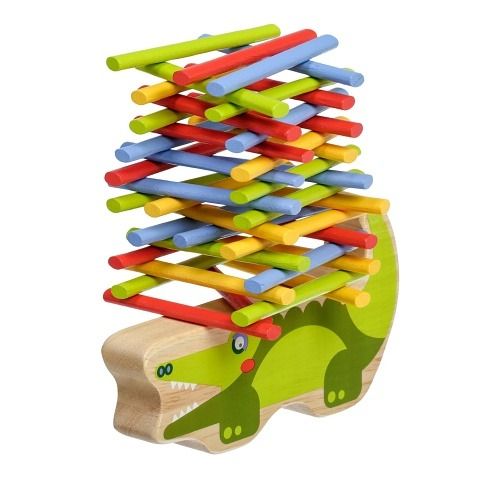 Krokodýl je dřevěná balanční hra, která se skládá ze základny v podobě krokodýla a 40 barevných tyčinek ve čtyřech základních barvách. Cílem hry je umístit všechny barevné tyčinky ve stylu hry „Jenga“ na horní stranu krokodýla tak, aby byla věž vyvážená a nespadla. Je to skvělý způsob, jak u dětí zábavným způsobem trénovat trpělivost, podporovat jemnou motoriku, naučit je pečlivému plánování a celkově vyzkoušet jejich schopnosti v jednoduché a zábavné výzvě. Součástí balení je uzavíratelný bavlněný pytlík, do kterého si sadu pěkně uložíte a lze ji vzít kamkoli s sebou. Rozměr bavlněného pytlíku 17 x 23 cm. Délka krokodýla 14 cm, výška 8 cm, šířka 2 cm. Délka tyčinek 7,5 cm.
