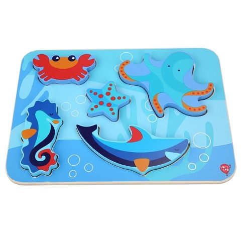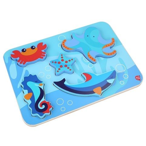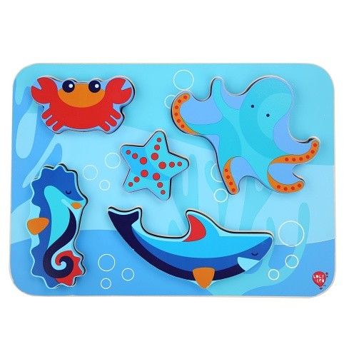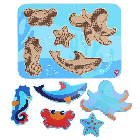 Mořští živočichové je dřevěné vkládací puzzle bez úchytek s motivem živočichů žijících v moři, které potěší holky i kluky. Na hladké barevné desce jsou nakreslená různé zvířátka. Šest vystouplých dřevěných tvarů zvířátek lze jednoduše uchopit a vložit do správných vyfrézovaných drážek na barevnou desku. Díly jsou velké, krásně ilustrované a dětem se díky své velikosti berou velmi dobře do ruky. Tvar a tloušťka jednotlivých dílků umožňuje zvířátkům i samostně stát. Na této vkládačce si děti procvičí jemnou motoriku, prostorovou orientaci a v neposlední řadě trpělivost. Výška desky 21 cm, délka 29 cm, velikost živočichů cca 13,5 a 5 cm, tloušťka cca 1 cm.