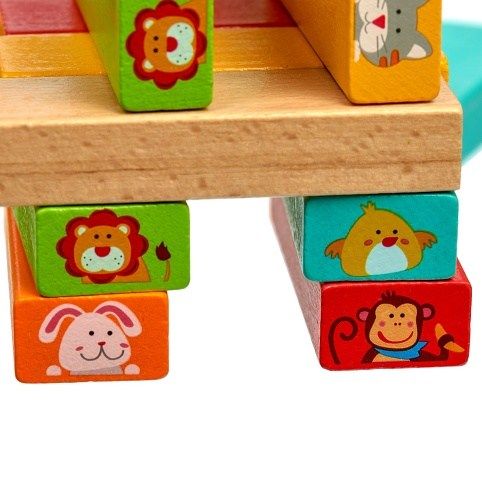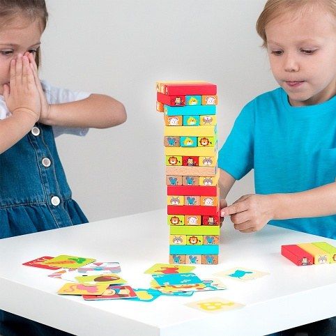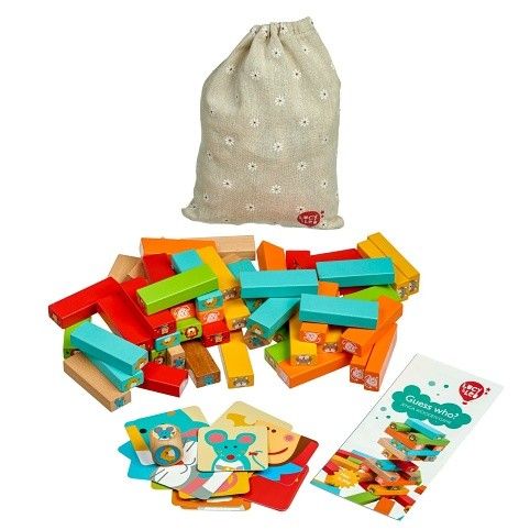 „Hádej, kdo“ je dětská dřevěná hra Jenga. Hladké dřevěné bloky s obrázky zvířátek jsou nejprve naskládány do vysoké věže a cílem hry je odebrat je tak, aby věž nespadla. Na každém bloku je jiné zvíře a hráči se střídají ve výběru zvířete a odstranění odpovídajícího bloku z hromádky. Zvířátka na blocích se vybírají buď pomocí hodu na přiložené kostce, nebo speciálních kartách, kde děti budou muset uhodnout zvíře, aby mohly vybrat potřebný blok. Hra obsahuje řadu pravidel, díky kterým bude hra zábavná pro několik hráčů. Kostky lze navíc použít jako stavebnici, nebo dokonce jako základ pro jinou hru, pokud si vymyslíte vlastní pravidla. I obrázkové kartičky lze využít pro různé jiné hry, třeba jako pexexo. Hra zábavným způsobem podporuje jemnou dětskou motoriku, logické myšlení, představivost, ale i trpělivost. Hra obsahuje 54 dřevěných barevných bloků, na nichž jsou vyobrazena zvířátka, 24 barevných karet s různým vyobrazením zvířátek nebo jen jejich částí, 1 hrací kostku se zvířátky, lněný pytlík a pravidla. Rozměry bloků 7,5 x 2,5 x 1,5 cm.