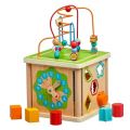 Dřevěná motorická kostka 5v1 s hodinami kombinuje několik vzdělávacích a zábavných prvků najednou. Nahoře najdete korálkový labyrint se třemi zakřivenými kolejnicemi, který se dá vyjmout a otočit směrem do kostky tak, aby byl zcela uschován. Na ostatních stranách jsou hodiny s ručičkami, 2 vkládačky geometrických tvarů a barevné počítadlo. Všechny strany jsou barevně zdobeny tak, aby udržely pozornost dítěte, podporovaly jeho fantazii a senzomotorické schopnosti.
