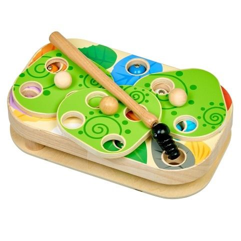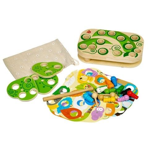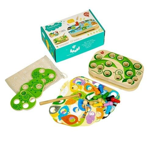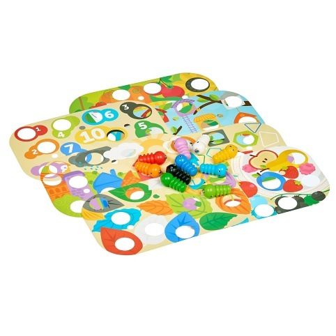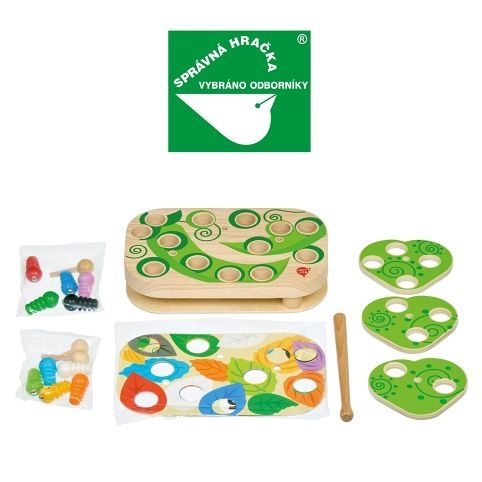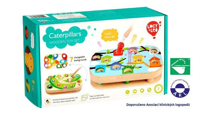 Chytání housenek je dřevěná motorická stolní hra s magnety, která se skládá ze základní dřevěné desky, 9 barevných vyměnitelných předloh, 10 barevných housenek s magnetem, magické hůlky s magnetem, 3 otáčivých listů, 3 kolíků pro upevnění listů a lněného pytlíku. Šibalské housenky začaly hrát na schovávanou! Najděte a chyťte je společně s dětmi pomocí kouzelné hůlky s magnetem. Způsobů, jak pochytat housenky je spousta. Pro menší děti přiložte na základní desku jednu z barevných předloh, vložte housenky do otvorů například podle barev a lov kouzelnou magnetickou hůlkou může začít. Vyměňováním předloh mohou děti housenky lovit například z barevných listů, domečků nebo také podle čísel. Starším dětem ztížíte chytání housenek tím, že na předlohu přidáte otáčivé listy, které zafixujete kolíkem tak, aby se mohly po předloze rotačním způsobem pohybovat a tím lovení ztížíte. Tato hra je velmi užitečná pro rozvoj logického myšlení, kreativity, obratnosti a dětské motoriky. Součástí výrobku je lněný pytlík, do kterého si menší části hry pěkně uložíte.
