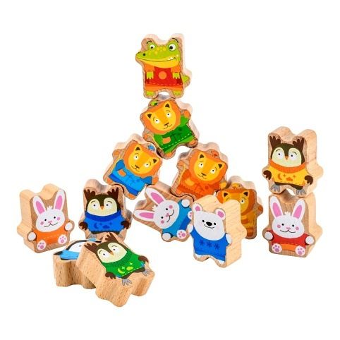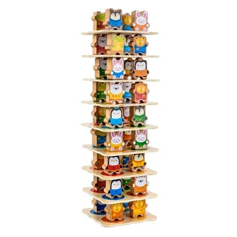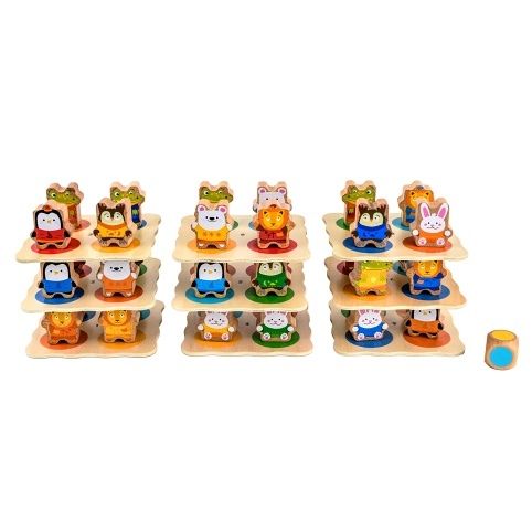 Zvířecí věž je dřevěná herní sada, která pomáhá dětem rozvíjet prostorovou představivost, jemnou motoriku a logické myšlení. Pomozte zvířátkům najít jejich místo na kartách v souladu s barvami a postavte věž. Herní sada obsahuje 1 šestihrannou kostku s barvami, 9 karet s barvami a 36 dřevěných zvířecích figurek. Principem hry je házet kostkou a umísťovat zvířátka dle barev na hrací karty a tím vytvářet stabilní věž, nebo jí opačně rozebírat, aniž by nějaké zvířátka spadlo. Nebo můžete hrát postřehovou hru, kdo nejrychleji přiřadí zvířátka na své barevné karty, ať už s pomocí kostky nebo bez ní. Zvířátka můžete na sebe stavět také bez karet a tím procvičíte balanc. Po skončení hry lze zvířátka umístit do lněného pytlíku. Rozměr dřevěného zvířátka 4,5 cm x 4 cm x 3 cm. Rozměr dřevěných karet 13 cm x 13 cm. Rozměr kostky 3 cm x 3 cm x 3 cm.