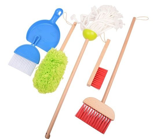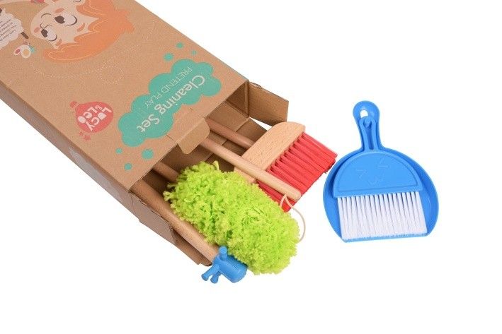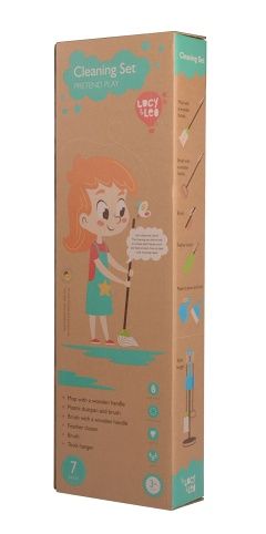 Uklízecí sada je dřevěná hračka, která nesmí chybět v žádné domácnosti. Vytírání, zametání nebo utírání prachu jde s tímto uklízecím setem zcela snadno a každý kluk či holčička tak mohou doma začít pomáhat s drobným úklidem. Děti se tak učí zábavným a hravým způsobem základům běžného úklidu v domácnosti. Hračka pomáhá rozvíjet motorické dovednosti dítěte a jeho smysl pro odpovědnost. Sada obsahuje: velký smeták, mop, prachovku, malý smeták s rukojetí, plastový smetáček s lopatkou a stojan, na který si po skončení úklidu všechny pomůcky pověsíte. Stojan je stabilní a spolu s náčiním odpovídá dětské velikosti. Rozměry výrobku: 20 x 20 x 67 cm. Dřevěné díly vyrobeny z pryžového dřeva (Hevea).