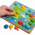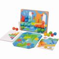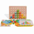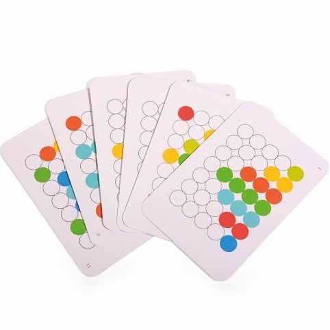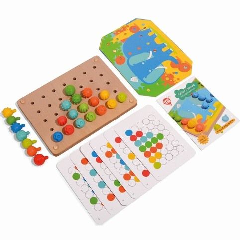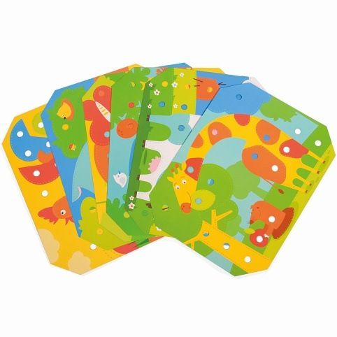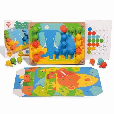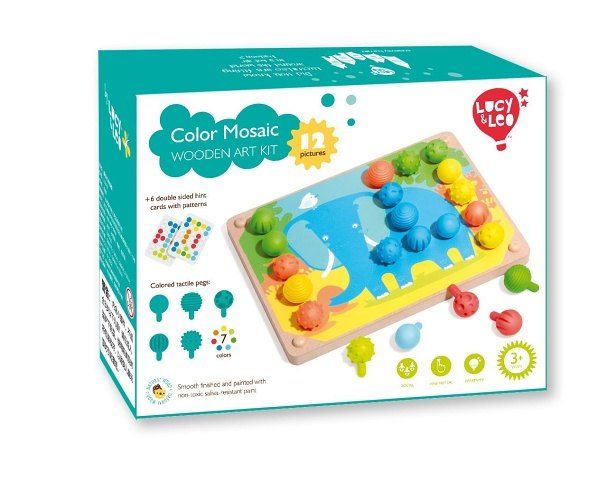 Mozaika a vyšívání je herní set pro děti rozvíjející jemnou motoriku a tvořivé myšlení. Balení obsahuje 35 velkých silikonových kolíčků s odlišně strukturovaným povrchem v 7 barvách. Dále obsahuje 12 barevných obrázků se zvířátky a 6 oboustranných předloh, dřevěný podstavec s otvory na kolíčky a 4 barevné tkaničky k vyšívání. Dítě si vybere jednu z barevných předloh, položí na dřevěný podstavec a začne obrázek vyplňovat barevnými kolíčky. Starší děti mohou skládat podle oboustranných předloh, které se na podstavec už nepřikládají. Pokud děti mají chuť, mohou barevnými tkaničkami také vyšívat. Rozměr dřevěného podstavce 20,5 x 15 cm. Délka tkaniček 64 cm. Délka kolíčku s kulatou hlavičkou 2,8 cm, průměr 1,5 cm. Tato hračka je označována jako Montessori pomůcka.