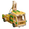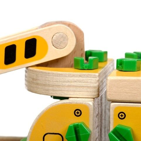 Dřevěná konstrukční sada Autojeřáb zaujme především chlapce. Sada obsahuje spoustu dřevěných dílů, šroubů a nářadí pro montáž, plus dřevěné kostky představující náklad. Po sestavení a sešroubování všech dřevěných dílů získá malý stavitel krásný autojeřáb. Přiložené samostatné kostky různých barev představující náklad mají na vrchní straně háčky, díky kterým je hák na autojeřábu může zvednout a přemísťovat. Kromě jemné motoriky se dítě při hře s touto hračkou naučí rozlišovat tvary a barvy, trénovat paměť, pozornost a trpělivost. Balení obsahuje 16 dřevěných dílů k sestavení auta, spoustu šroubků, 1 šroubovák, 4 barevné kostky jako náklad. Tato hračka je označována jako Montessori pomůcka.