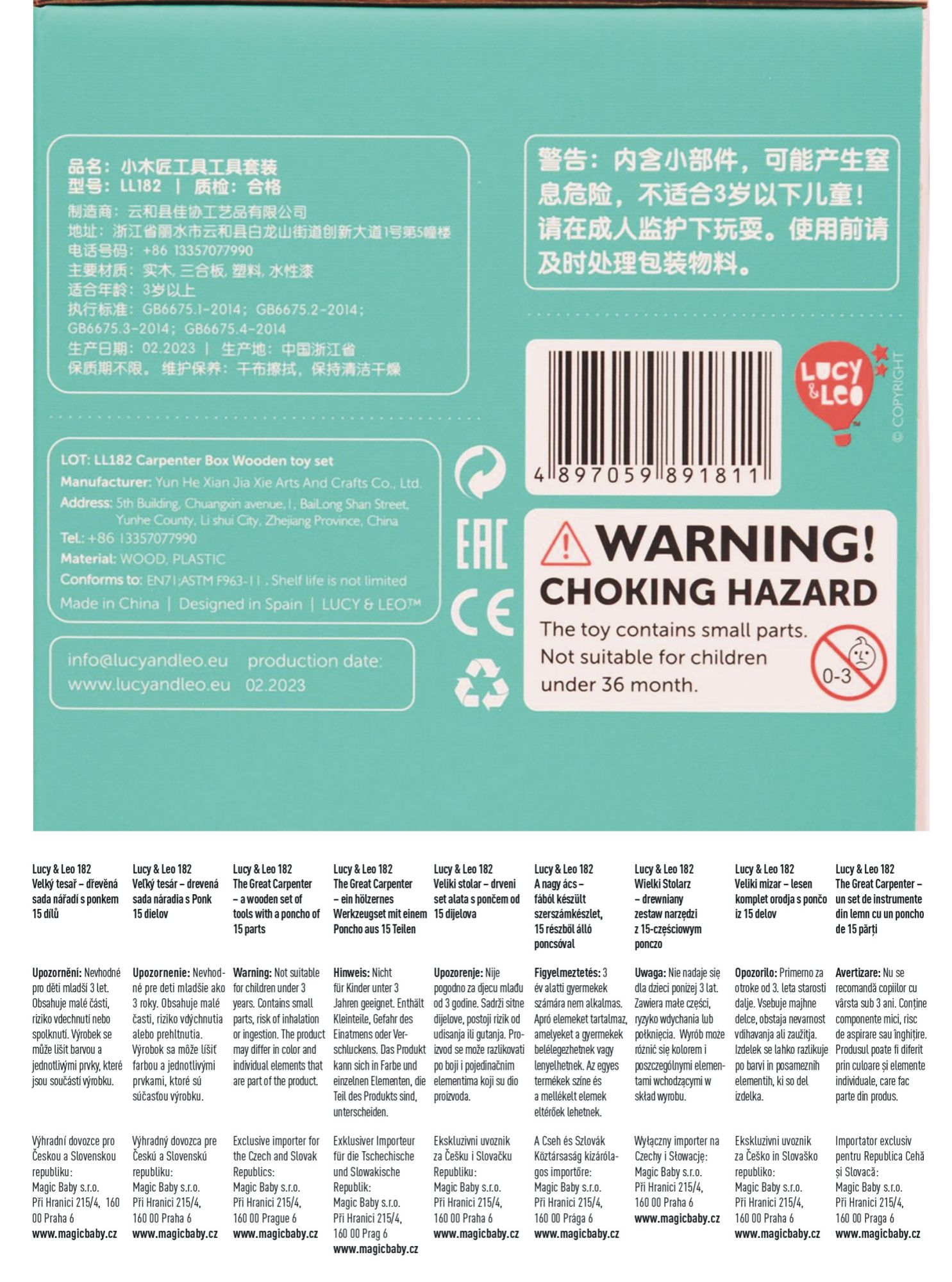 Dřevěná sada nářadí s ponkem „Velký tesař“ je hračka pro malé děti, které se při hraní mohou učit o řemeslu. Sada se skládá z 15 dílů a je vyrobena z plastu a kvalitního dřeva s hladkou povrchovou úpravou. Obsahuje sortiment dětského nářadí, jako je kladivo, pilka, šrouby, šroubovák, klíč, svěrák a několik kusů hladkého dřeva s otvory. Všechno nářadí si můžete uspořádat do dřevěné přenosné bedýnky, kterou když otočíte naopak, promění se v pracovní stůl – ponk. Sada podporuje nápadité a kreativní myšlení, zdokonaluje jemnou motoriku. Rozměry bedýnky/ponku délka 21 cm, šířka 12,5 cm, výška 12 cm. Hladké kousky dřeva s otvory délka 7 cm, šířka 3,5 cm. Délka pilky 17 cm. Délka kladiva 16 cm. Délka šroubů 6 cm. Průměr matek 4 cm.