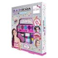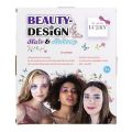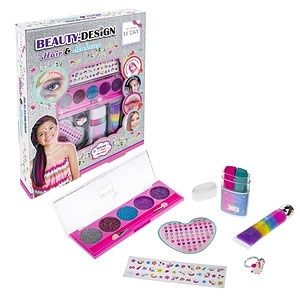 Sada Beauty-Design"Vlasy a makeup". Obsah: 1× samolepy na nehty, 1× lesk na rty s jahodovou příchutí, 1× prstýnek „jednorožec“, 1× náleky „drahokam“ na obličej a nehty, 1× třpytivé krémové oční stíny s aplikátorem, 1× křída na vlasy. Pro děti od 3let.