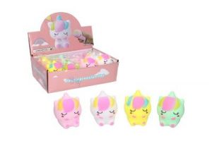 Mačkací jednorožec tvarovací. Velikost 8 cm. Display box 12 ks. 4 varianty - růžová, žlutá, bílá, zelená.