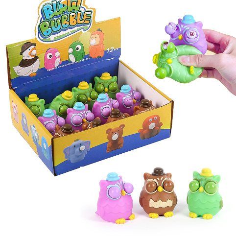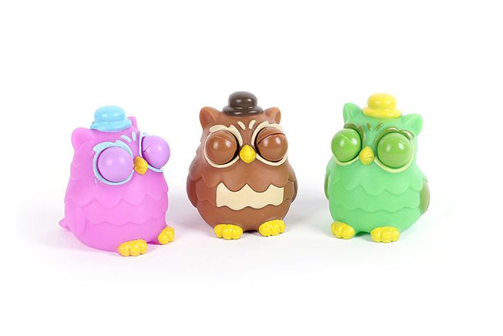 Mačkací sova. Velikost 7 cm. 12 ks display box. 3 varianty - fialová, hnědá, zelená.