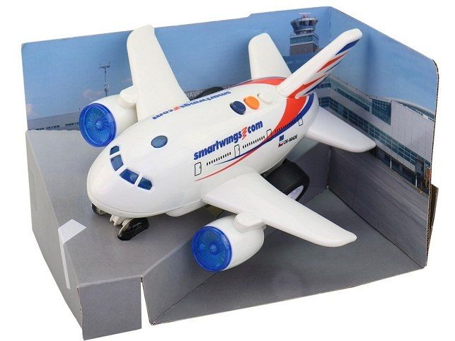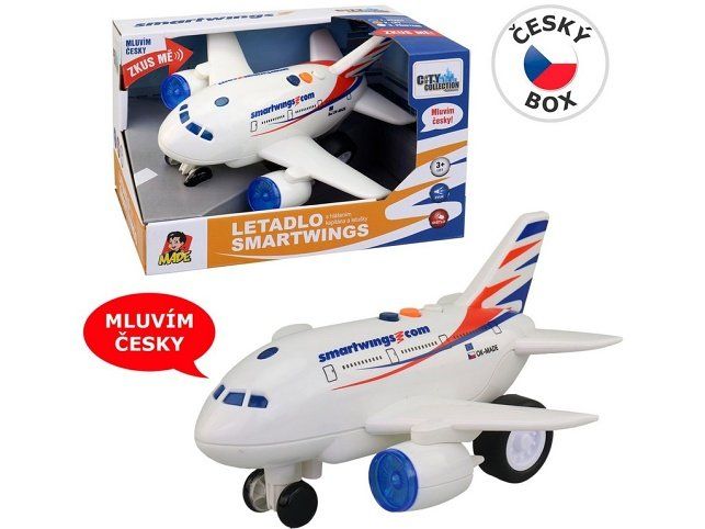 LETADLO SMARTWINGSLetadlo s hlášením kapitána a letušky, na setrvačník. Dětské letadlo smartwings s hlášením kapitána a letušky. Letadélko je vybaveno světelnými efekty a známým hlášením. Hlášení je stejné jako v opravdovém letadle!1. Start (letuška - ženský hlas): Vítejte na palubě letadla Smartwings. Bezpečně uložte svá zavazadla a připoutejte se prosím. Mobilní telefony musí zůstat vypnuty po celou dobu letu. Za okamžik budeme startovat. Přejeme vám příjemný let. 2. Let (pilot - mužský hlas): Hovoří k vám kapitán. Nacházíme se ve výšce deseti kilometrů a právě přelétáme nad Alpami. Počasí je jasné a klidné. Užijte si krásný výhled. 3. Přistání (letuška - ženský hlas): Dámy a pánové, zůstaňte prosím sedět na svých místech, dokud letadlo nezastaví. Naše posádka se s vámi loučí. Děkujeme, že jste si pro svůj let vybrali společnost Smartwings a přejeme vám hezký den. Napájení: 3 x AG13 (baterie jsou součástí balení). Rozměr hračky je 18,8 x 18,8 x 12 cm. Materiál hračky je plast.