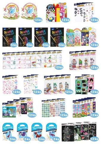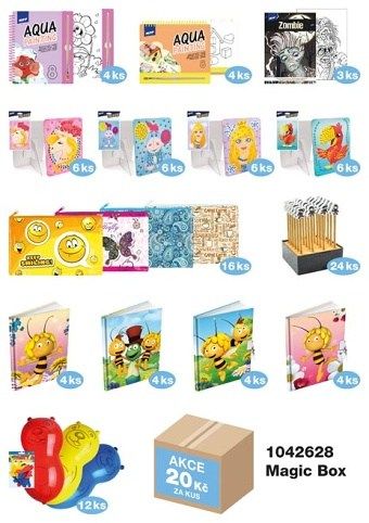 Celoroční Magic BOX je pestrý balíček plný zábavy a tvoření, který obsahuje celkem 443 ks různých kreativních a dětských produktů. Najdete v něm například samolepky, omalovánky, scratch art obrázky, výtvarné a kreativní sady, bločky, razítka, tužky a další drobnosti s veselými motivy pro kluky i holky. Produkty jsou určeny pro celoroční využití a ideálně se hodí do škol, školek, dětských koutků nebo jako překvapení pro děti. V případě vyprodání některých položek může být konkrétní produkt nahrazen jiným podobným. Všech 443 ks je baleno v kartonové krabici. Uvedená cena je za 1 ks.