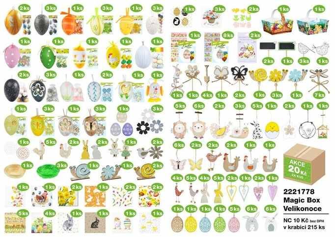 Velikonoční Magic BOX. Box obsahuje 215 ks různých velikonočních ozdob a dekorací. Naleznete zde např. samolepicí okenní fólie, dekorace na pověšení i postavení, zápichy do květináčů, kolíčky, barevná plastová vajíčka, velikonoční kuřátka nebo dekorační hnízda a sisal. Dekorace jsou z různých materiálů jako je dřevo, plast, papír, kov aj. Široká škála velikonočních ozdob zaručí, že budete mít vše, co potřebujete k jarní výzdobě Vašeho domova. V případě vyprodání některého z produktů může být nahrazen jiným. Vše v jednotné akční ceně. BALENÍ OBSAHUJE: - 215 ks ozdob Všech 215 ks je baleno v kartonové krabici. Uvedená cena je za 1 ks.