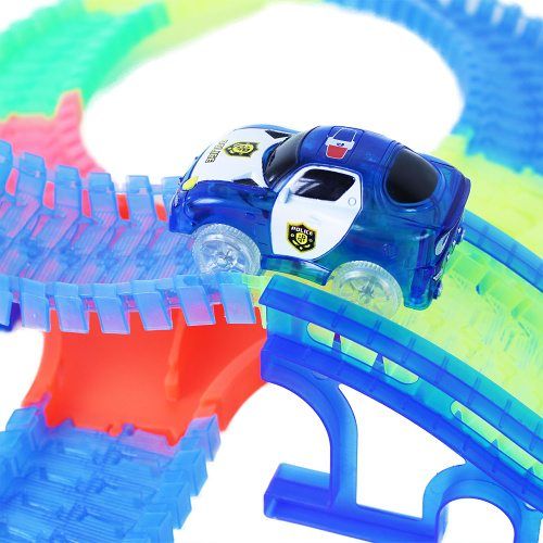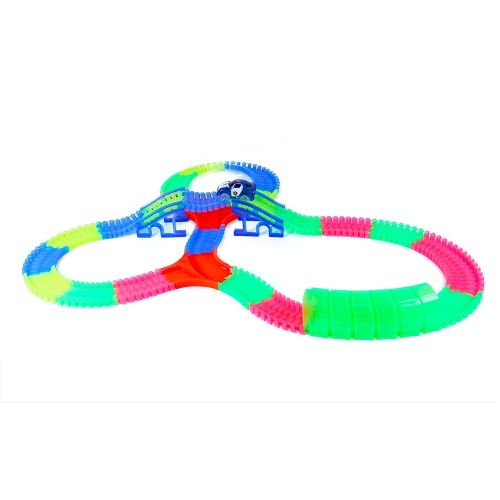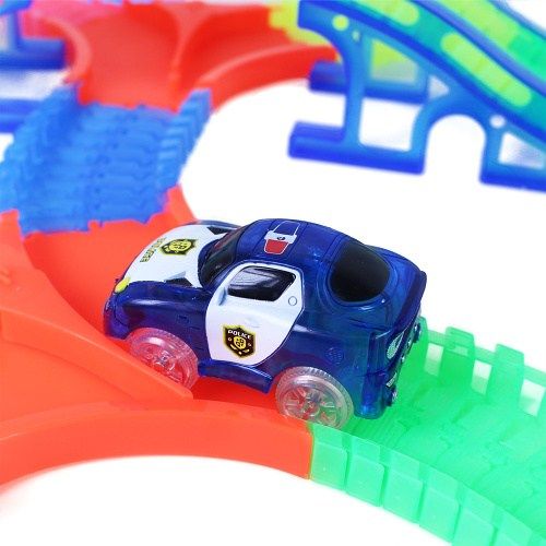 Svítící magická dráha. Součástí je rychlé autíčko, které svítí díky LED světlům. Funguje na 2 x 1.5V AAA baterie. Můžeš postavit různé varianty dráhy. Součástí jsou křižovatky a přemostění. Celkem 204 dílků.