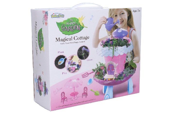 Domeček, květináč, zemina, semínka, zahradní náčiní, konvička, zahradní posezení. Domeček hraje příjemnou melodií a svítí. 3xAG13 baterie součástí.