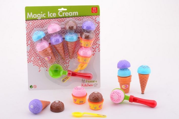 Plastová sada zmrzlin pro malé kuchařky. Sada obsahuje různé druhy kornoutků, kopečky zmrzliny, lžičku a tvořítko na kopečky.