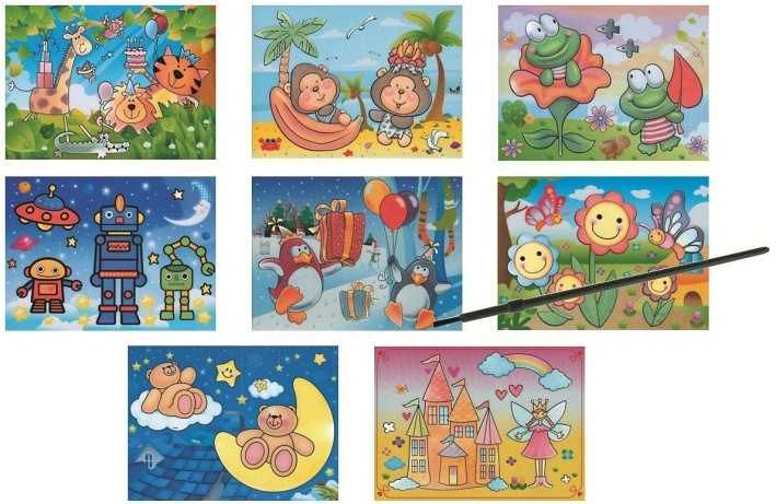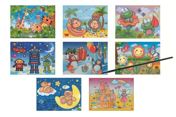 Malování vodou se štětcem 20x15cm MAGICKÉ MALOVÁNÍ VODOU! Maluj po bílé ploše a jako kouzlem se objeví pestrobarevný obrázek, po zaschnutí obrázek opět zmizí a můžeš malovat znovu. NÁVOD: Do kelímku s čistou vodou namoč štětec. Maluj po bílé ploše a jako