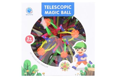 Teleskopický magický míč. Po hození míč magicky rozkvete a zvetší svůj objem. Rozměr složeného míčku 16 x 16 x cm, rozměr rozloženého míčku 33 x 33 x 33 cm. Rozměr balení cca 16 x 16 x 16 cm. Věk 3+