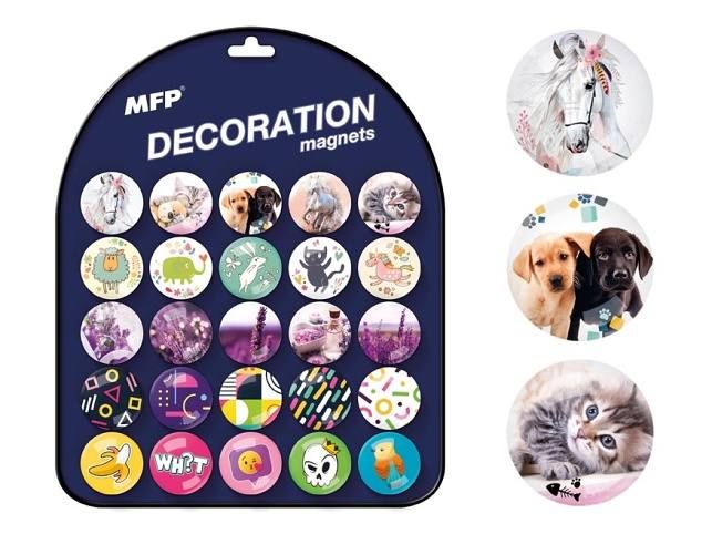 Dekorační kulatý magnet v motivech kreslených zvířátek, průměr magnetu 35mm, na magnetické tabulce je 25 různých designů magnetů.